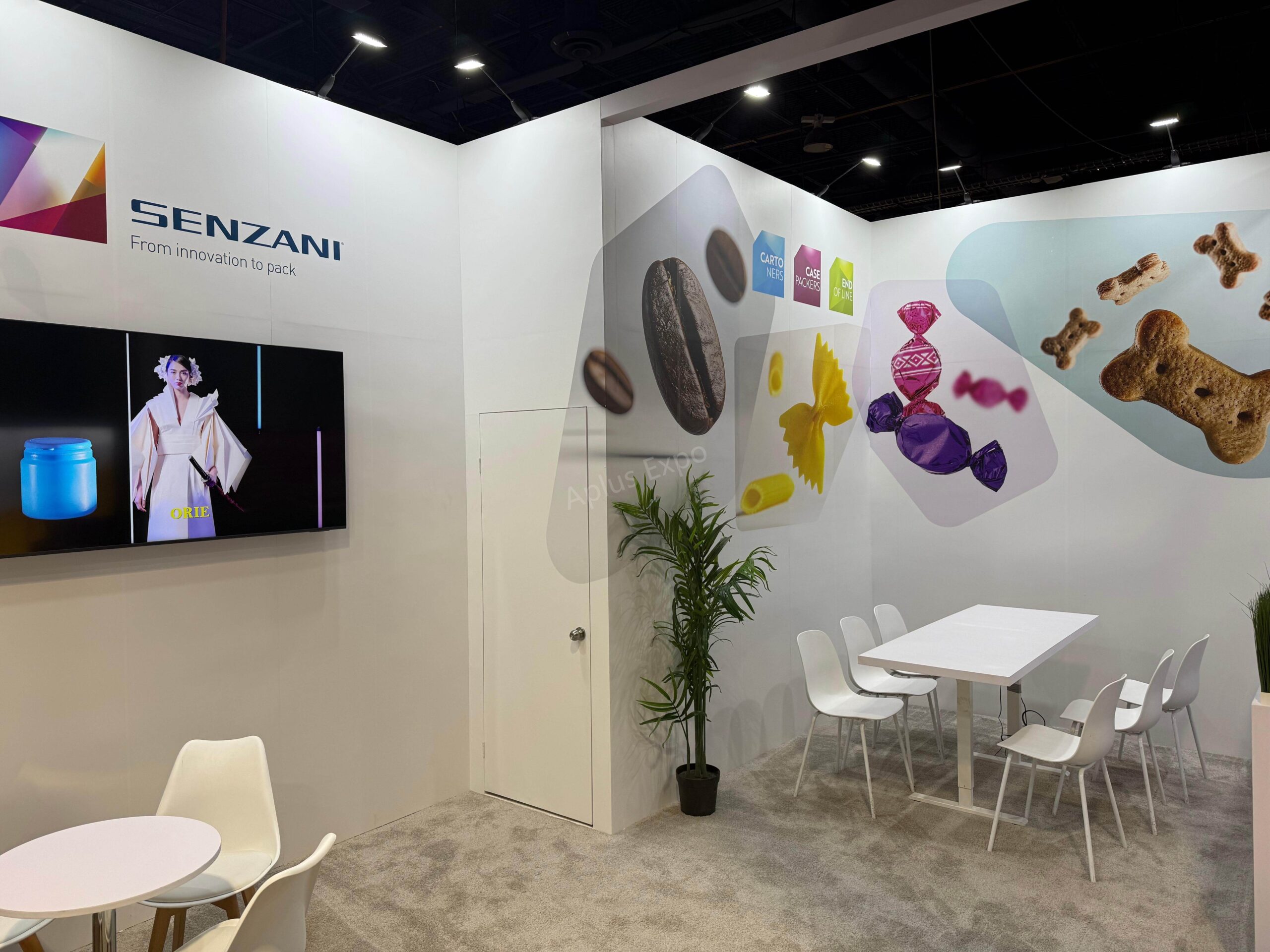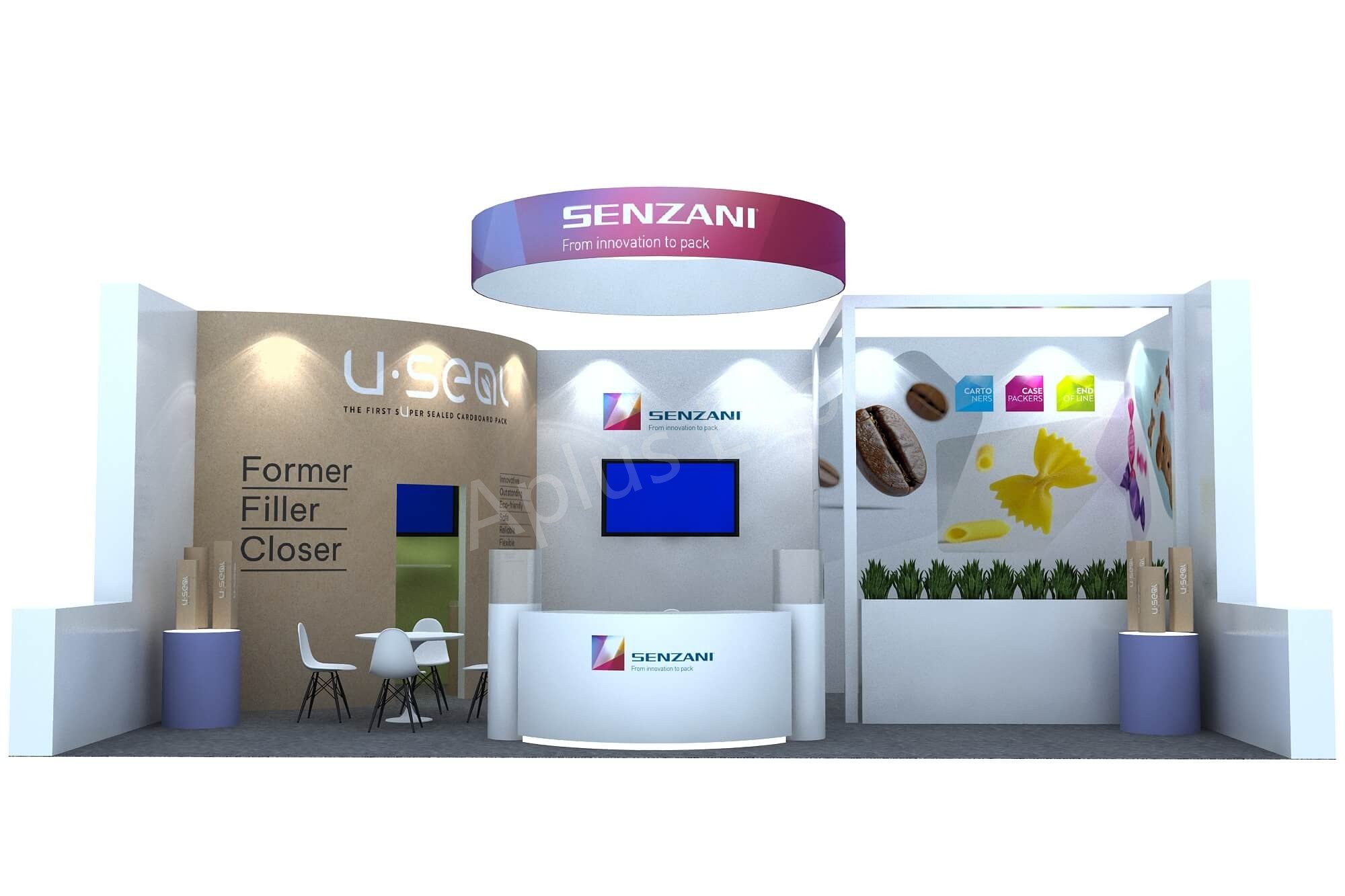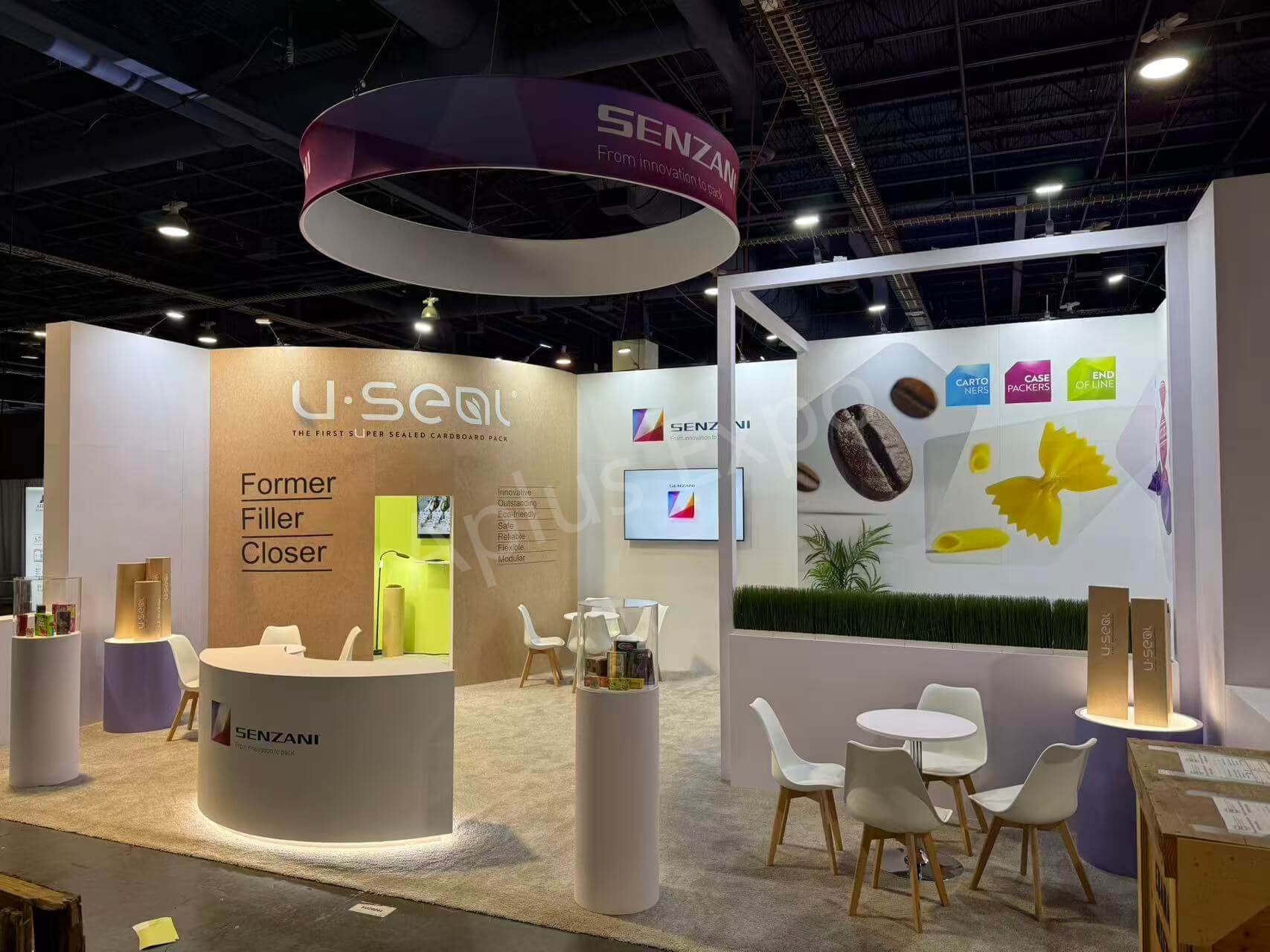 ✖️Aplus Expo présente un stand d'exposition haut de gamme de 20′ x 30′ pour Senzani à PACK EXPO 2025.